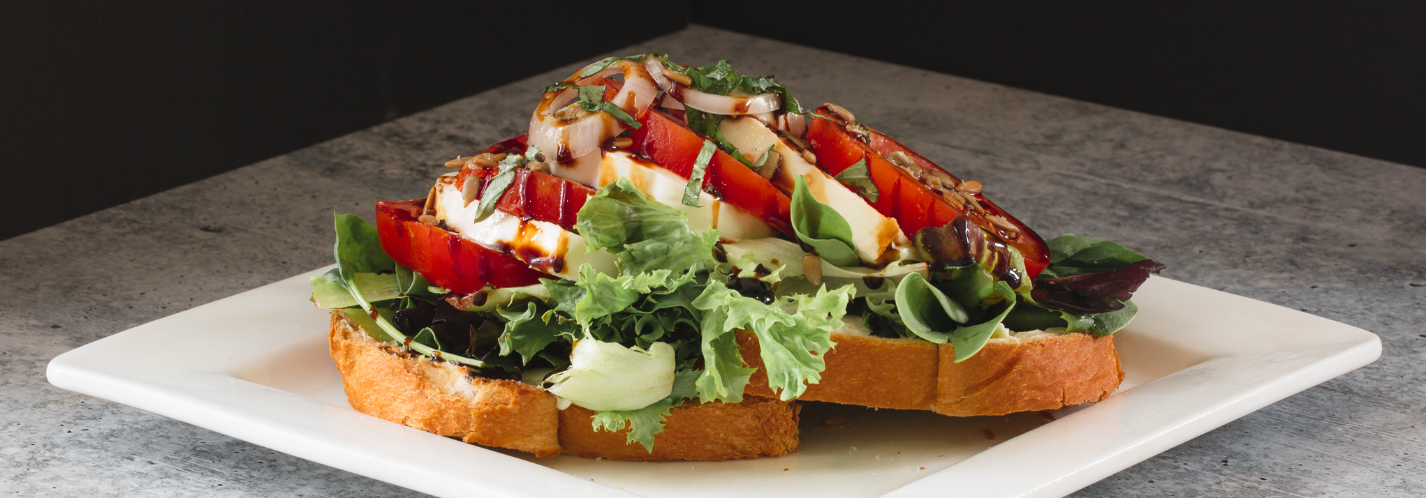 Ghyslain Brioche, heirloom tomato, fresh mozzarella, basil, shallot, sunflower seeds, field greens, balsamic glaze, whipped cream cheese.