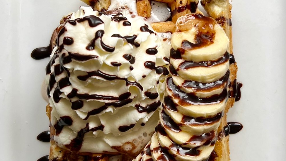 Liege waffle topped with fresh strawberries, blueberries, and house made Nutella whip cream.